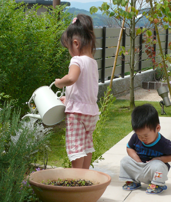 壁の曲線に誘われるように中に入っていくと、いろいろな植栽や草花が視界に入ってきました。一面グリーンの芝生と、色とりどりの花壇が、秘密の公園を思わせます。 お花に水やりをするお姉ちゃんと、アリを見つめるボク。 庭と触れ合い、植物や生き物を愛でる気持ちが、きっと家族みんなのこころを豊かにしてくれるのだと感じました。 |