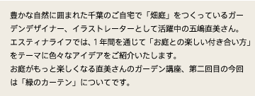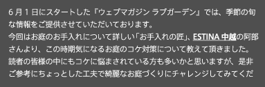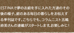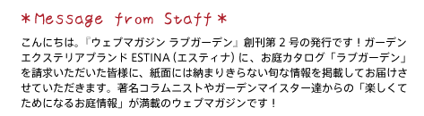 こんにちは。『ウェブマガジンラブガーデン』創刊第2号の発行です!ガーデンエクステリアブランドESTINA(エスティナ)に、お庭カタログ「ラブガーデン」を請求いただいた皆様に、紙面には納まりきらない旬な情報を掲載してお届けさせていただきます。著名コラムニストやガーデンマイスター達からの「楽しくてためになるお庭情報」が満載のウェブマガジンです!