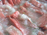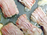 ![]() (2)のフライパンに、漬けこんでおいた肉(冷蔵庫から出して常温に戻しておく)を袋から箸で取り出し、肉同士が重ならないように並べる。クレイジーソルトを少々ふりかけ、強火で両面を焼く。 |