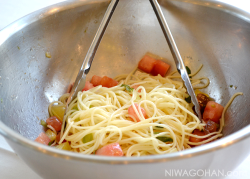- 大きめのボウルに、カッペリーニ以外の材料を入れてなじませておく。