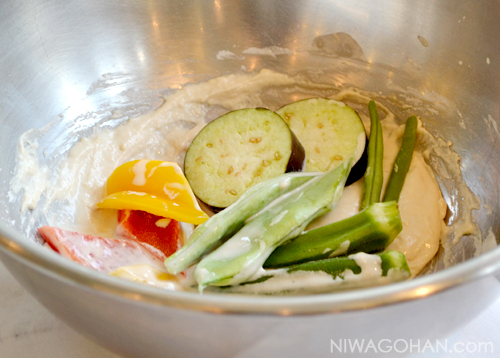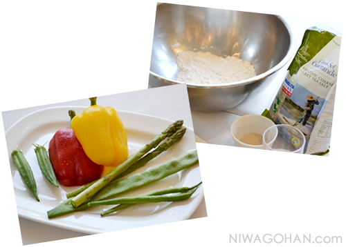 - 180℃~190℃の油で、(1)のフリット衣にくぐらせた野菜を揚げる。