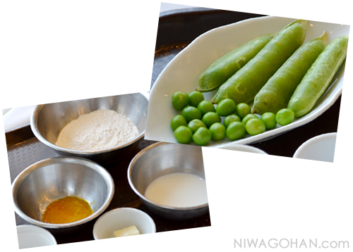 - 生地がまとまってきたらグリーンピースを入れ、ざっくり混ぜ合わせる。