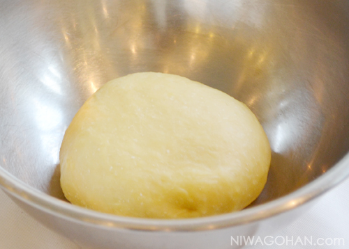 - 生地を60分発酵させた後、2つに分けてそれぞれ丸く成形する。