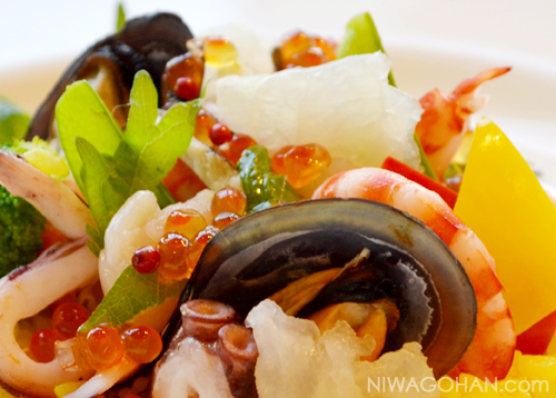 その上にお好みの魚介類、飾り野菜を盛りつけて完成。