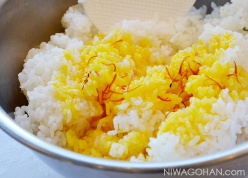 - お米が炊けたらボールに移し、(1)のサフラン水を入れて混ぜ合わせる。