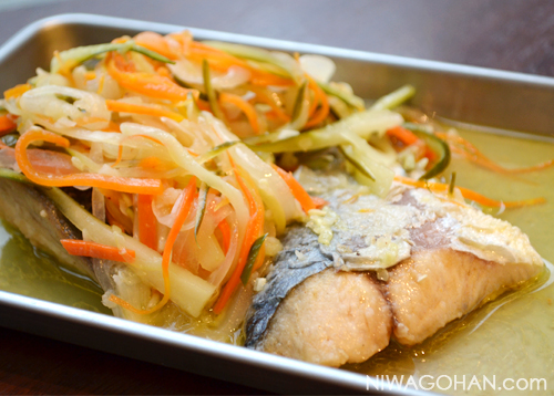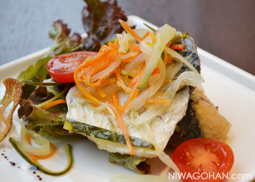 - 油をきった(4)の鯖をバットに移し、鯖が熱いうちに(3)のマリナードをかけて味をなじませる。