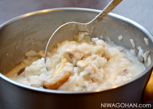 - (2)にご飯(パラパラにほぐしたもの)を入れ、お湯を少しずつ加える。