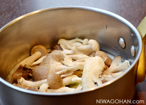 - 鍋にバターを溶かし、きのこ類を炒める。